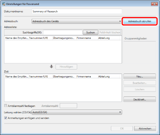 Wenn Sie dreimal hintereinander ein falsches Passwort eingeben, wird das [Passwort eingeben]-Dialogfeld geschlossen, und das [Einstellungen für Faxversand]-Dialogfeld wird erneut geöffnet, ohne dass die Adressbuchdaten abgerufen wurden.