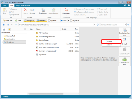 Sie können denselben Vorgang auch ausführen, indem Sie auf die im Menüband oder in der Symbolleiste angezeigte Mailausgabetaste klicken und [Ändern] wählen. Wenn ein Ausgabesymbol nicht im Menüband oder in der Symbolleiste angezeigt wird, lesen Sie in folgenden Abschnitten nach, wie Sie es anzeigen.
