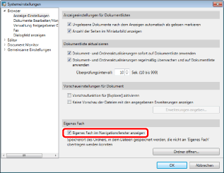 Wenn die Einstellungen des Ordners „Eigenes Fach“ nicht für die Verteilung von Dokumenten konfiguriert sind und wenn das Kontrollkästchen [Eigenes Fach im Navigationsfenster anzeigen] deaktiviert ist, wird der Ordner „Eigenes Fach“ nicht angezeigt.