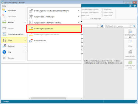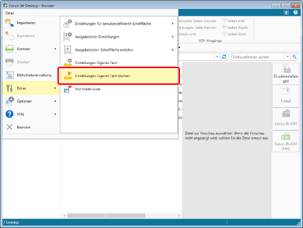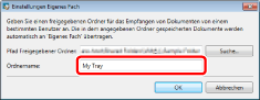 Wenn Sie einen bereits registrierten Ordner „Eigenes Fach“ neu konfigurieren oder löschen möchten, kann er nicht neu konfiguriert oder gelöscht werden, wenn sich Dokumente im Ordner „Eigenes Fach“ befinden. Löschen Sie zuerst die Dokumente aus dem Ordner „Eigenes Fach“, bevor Sie ihn konfigurieren oder löschen.