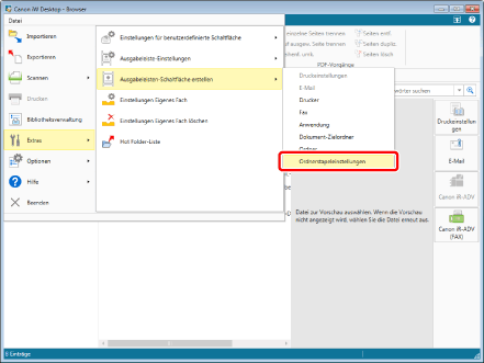 Wählen Sie im Menü [Datei] > [Extras] > [Ausgabeleisten-Schaltfläche erstellen] > [Ordnerstapeleinstellungen].