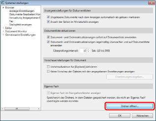 Klicken Sie in [Speicherort des Ordners, in dem Dateien gespeichert werden, die nicht an 'Eigenes Fach' übertragen werden konnten] auf [Ordner öffnen].