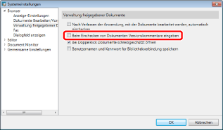 [Systemeinstellungen] > [Browser] > [Verwaltung freigegebener Dokumente] > [Beim Einchecken von Dokumenten Versionskommentare eingeben]