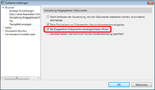 [Systemeinstellungen] > [Browser] > [Verwaltung freigegebener Dokumente] > [Bei Doppelklick Dokumente schreibgeschützt öffnen]