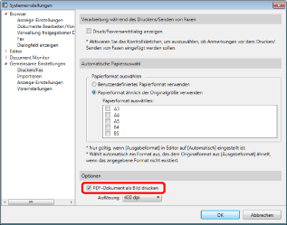 Wenn das Kontrollkästchen [PDF-Dokument als Bild drucken] aktiviert ist, werden alle PDF-Dokumente als Bilder gedruckt bzw. gefaxt. Wenn Sie das Kontrollkästchen deaktivieren, werden sie wieder als PDF-Dokumente gedruckt bzw. gefaxt.