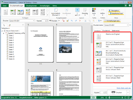 Ein Dokument, auf das die zutreffenden Einstellungen angewendet wurden, wird im Arbeitsfenster angezeigt. Die verfügbaren Einstellungsinformationen können bei einem Wechsel des Druckers beibehalten werden. Die Einstellungen werden nach dem eigentlichen Wechsel des Druckers angewendet.