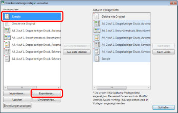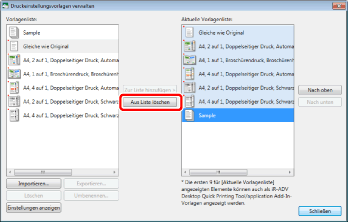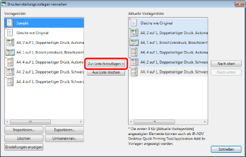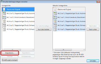 Die Vorlage wird importiert und unter [Vorlagenliste] und [Aktuelle Vorlagenliste] im Dialogfeld [Druckeinstellungsvorlagen verwalten] hinzugefügt.