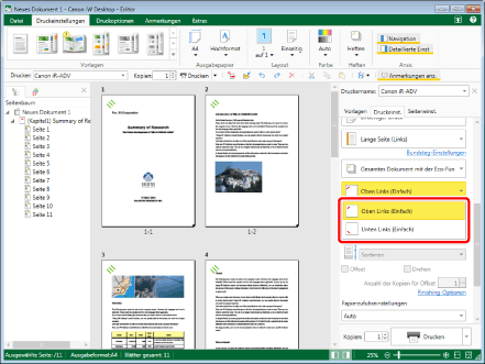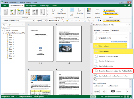 Wenn Sie Eco (Heftfrei) nicht verwenden möchten, wählen Sie [Keine Heftung] auf der Registerkarte [Druckeinst.] in der Detailansicht, im Menüband oder über die entsprechende Schaltfläche der Symbolleiste aus.