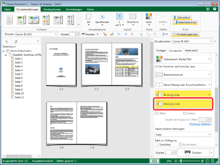 Wenn Sie das Kontrollkästchen [Original in Richtung Bindungsposition verschieben] aktivieren, werden die Einstellungen im Arbeitsfenster wiedergegeben.