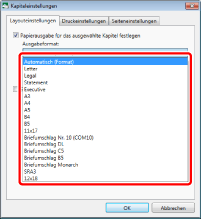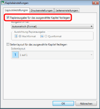 Wenn das Ausgabepapierformat für das gesamte Dokument oder jedes Kapital auf [Automatisch (Format)] eingestellt ist und das Kontrollkästchen [Seitenlayout für das ausgewählte Kapitel festlegen] nicht aktiviert ist und Sie das Seitenlayout für das gesamte Dokument nicht auf [1 auf 1] sondern einen anderen Wert einstellen, wird das für das Kapitel festgelegte Ausgabepapierformat deaktiviert.