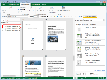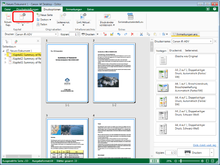 Diese Funktion ist nur möglich, wenn Sie einen Canon-Drucker auswählen und das Kontrollkästchen [Druckeinst. von Editor verw.] auf der Registerkarte [Druckeinst.] in der Detailansicht, im Menüband oder über die entsprechende Schaltfläche der Symbolleiste aktivieren.