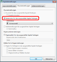 Wenn Sie bei aktiviertem Broschürendruck den Farbmodus auf Kapitelbasis ändern, wird die Farbmoduseinstellung eventuell auch für Seiten in Kapiteln geändert, deren Einstellungen Sie nicht bearbeitet haben.