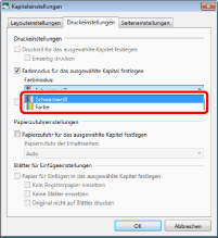 Wenn der unter [Drucker] ausgewählte Canon-Drucker Farbdruck nicht unterstützt, können Sie den Farbmodus auf Kapitelbasis nicht festlegen.