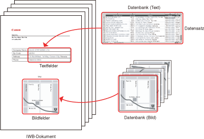 Die Seitenbereiche, die ersetzt werden, heißen "Seriendruckfelder". Es gibt sie sowohl für Text ("Textfelder") als auch für Bilder ("Bildfelder"). Die Seriendruckfeld-Einstellungen werden im Modus "Seriendruckeinstellungen" von Desktop Editor konfiguriert. Zum Speichern der Seriendruckeinstellungen in einem Dokument speichern Sie das Dokument im IWB-Format (*.iwb).