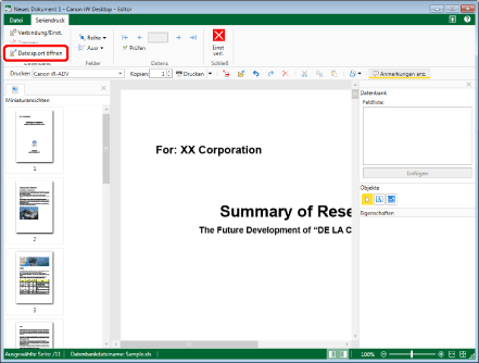 Sie können nicht auf [Dateisp.ort öffnen] klicken, wenn die Datenbank nicht festgelegt wurde. Nähere Informationen zum Festlegen einer Datenbankdatei finden Sie hier: