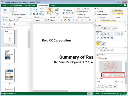 Sie können die Option [Datum und Uhrzeit bearbeiten] nicht für einen Textstempel anklicken, der kein Datum enthält. Nähere Informationen zum Hinzufügen eines Datums zu einem Textstempel finden Sie hier: