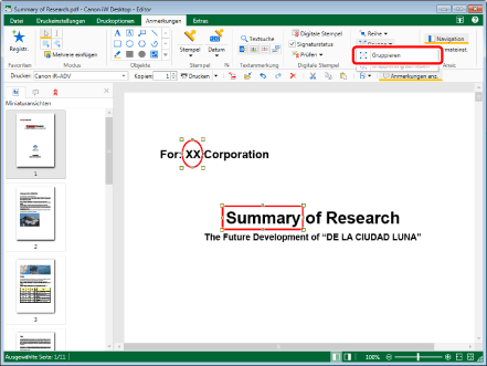 Sie können auch Gruppen wiederum gruppieren oder eine Gruppe aus einer einzigen Anmerkung erstellen. Wenn Sie zwei Gruppen erneut gruppieren, wird die vorhandene Gruppierung aufgehoben und der Inhalt beider Gruppen zu einer gemeinsamen Gruppe zusammengefasst.