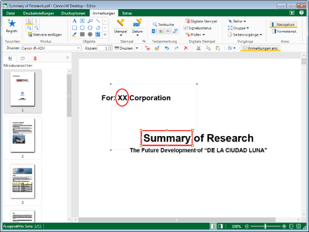 Wenn Sie dabei auf einen Textbearbeitungsbereich klicken, wird die Anmerkung ausgewählt und Sie können Text eingeben.