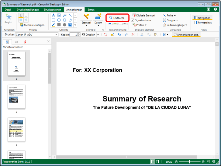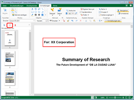 Im Anmerkungsmodus wird standardmäßig die Registerkarte [Miniaturansichten] im Navigationsfenster angezeigt.
