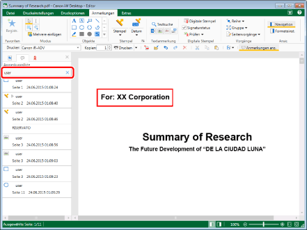 Wenn Sie Anmerkungen der Registerkarte [Anmerkungsliste] auswählen, werden die Anmerkungen im Arbeitsfenster ausgewählt. Wenn Sie jedoch eine Anmerkung auf einer anderen als der aktuell angezeigten Seite auswählen, wechselt die Anzeige des Arbeitsfensters zu der Seite mit der ausgewählten Anmerkung.