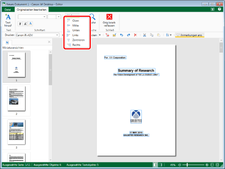 Wenn Sie ein Objekt im Arbeitsfenster auswählen, wird die Gesamtzahl der ausgewählten Objekte und die Anzahl der Textobjekte in der Statusleiste angezeigt.