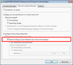 Wenn Sie das Kontrollkästchen [Benachrichtigung über erhaltene Faxe mit Symbol anzeigen] aktivieren, wird nach dem Faxempfang eine Benachrichtigungsmeldung angezeigt. Nähere Informationen zu dieser Meldung finden Sie hier: