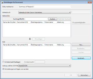Wenn Sie mehrere Dokumente in [Fax] abgelegt haben und das Kontrollkästchen [Jeweils eine Datei per Fax versenden, ohne mehrere Dateien zusammenzufassen] aktiviert war, wird das Dialogfeld [Einstellungen für Faxversand] für das nächste Dokument angezeigt. In diesem Fall wiederholen Sie die Schritte 5 bis 11.