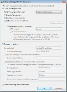 Wenn Sie aus Sicherheitsgründen den Zugriff auf das PDF-Dokument oder den Druck bzw. die Bearbeitung des Dokuments beschränken wollen, aktivieren Sie dieses Kontrollkästchen.