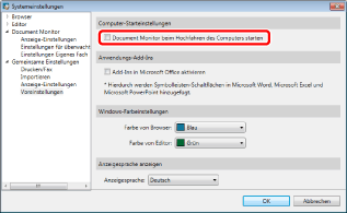 Um den Document Monitor beim Hochfahren des Computers zu starten, aktivieren Sie das Kontrollkästchen [Document Monitor beim Hochfahren des Computers starten].