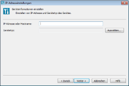 Wenn Sie die IP-Adresse oder den Hostnamen des Geräts in [IP-Adresse oder Hostname] eingeben und auf [Weiter] klicken, wird der automatisch abgerufene Gerätetyp angezeigt.