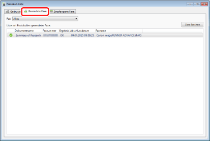 Die Felder [Name des Empfängers], [Firmenname] und [Abteilung] werden nur angezeigt, wenn das Kontrollkästchen ['Name des Empfängers', 'Firmenname' und 'Abteilung' im Protokoll gesendeter Faxe anzeigen] im Dialogfeld [Printer Monitor Einstellungen] aktiviert wurde. Für Empfängername, Firmenname und Abteilung werden die im Dialogfeld [Einstellungen für Faxversand] des Desktops angegebenen Informationen angezeigt.
