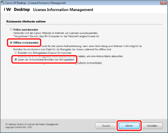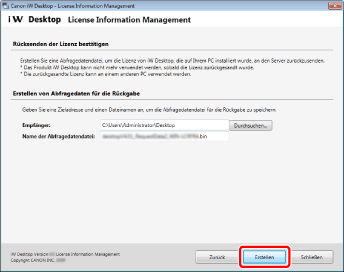 Senden Sie die Datenanforderungsdatei zur Lizenzrückgabe (*.bin) an Ihren Canon-Händler. Das Verfahren zur Rückgabe der Lizenz ist abgeschlossen, wenn die zurückgegebene Lizenz verarbeitet wird.