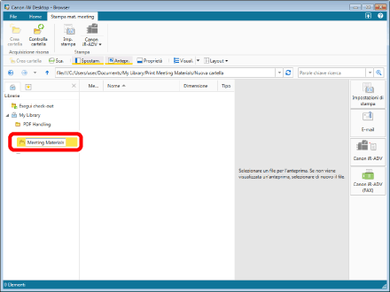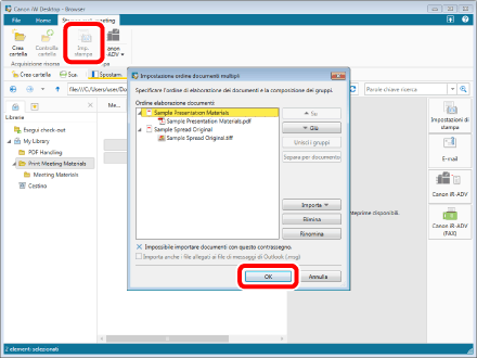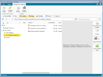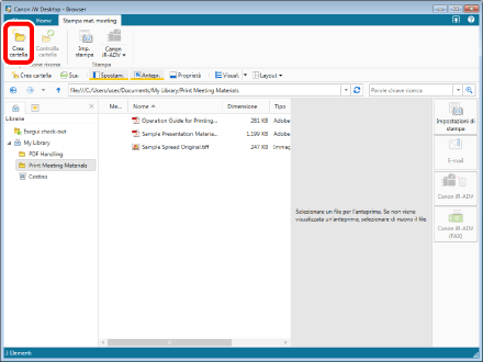 Selezionare la cartella "Print Meeting Materials" e selezionare Sample Presentation Materials.pdf e Sample Spread Original.tiff tenendo premuto il tasto [Shift] sulla tastiera.