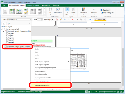Nella Struttura pagina, selezionare (Capitolo 2) Sample Spread Original, quindi fare clic con il pulsante destro del mouse e selezionare [Impostazioni capitolo].