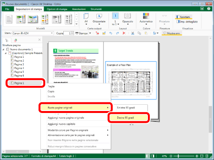 Nella Struttura pagina, selezionare Pagina 1 di (Capitolo 2) Sample Spread Original, quindi fare clic con il pulsante destro del mouse e selezionare [Ruota pagine originali] > [Destra 90 gradi].