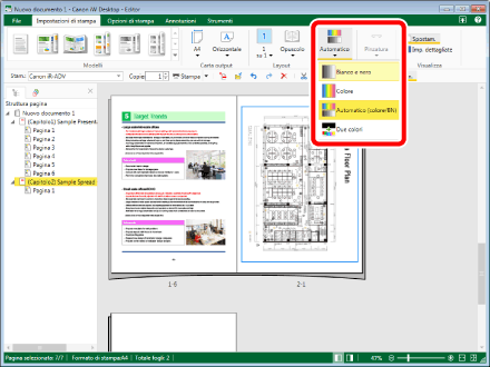 Fare clic su [Colore] sulla scheda [Impostazioni di stampa] e selezionare [Bianco e nero] nell'elenco a discesa visualizzato. L'intero documento viene impostato sulla stampa in bianco e nero.