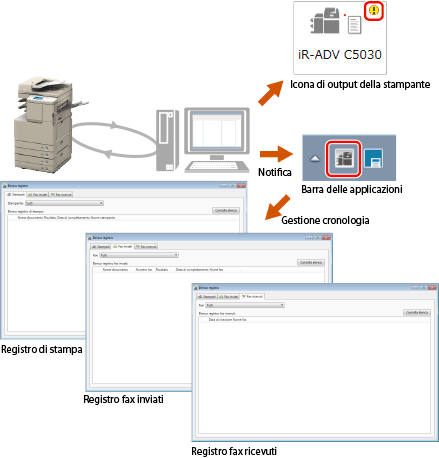 In Desktop è possibile verificare da un computer la stampa/invio di fax. L'icona dello stato di avanzamento nella barra delle applicazioni cambia in base allo stato del lavoro. In questo modo è possibile eseguire dal computer le attività che prima richiedevano più tempo, rendendo più efficienti le operazioni di stampa e invio fax.
