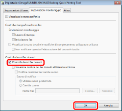Selezionare la casella di controllo [Controlla lavori fax ricevuti] nella scheda [Impostazioni monitoraggio] e fare clic su [OK].