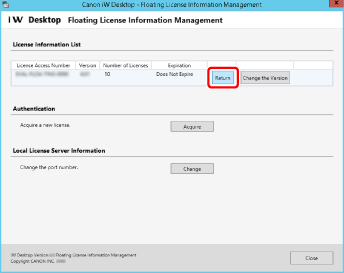 Inviare il file di richiesta dati per la restituzione (*.bin) al rivenditore Canon. La procedura di restituzione della licenza è completa quando la licenza restituita viene elaborata.