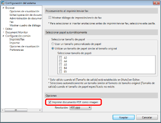 Si se selecciona la casilla [Imprimir documento PDF como imagen], todos los documentos PDF se imprimen/transmiten por fax en forma de imágenes. Anule la selección de la casilla de verificación para volverlos a imprimir/transmitir por fax como documentos PDF.