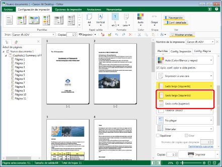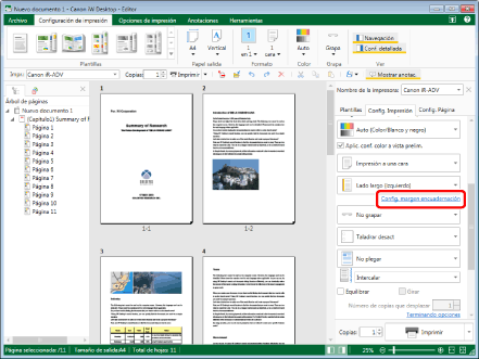 Esta función solo se puede utilizar si selecciona una impresora Canon y la casilla [Usar config. impr. de Editor] en la pestaña [Config. Impresión] de la Ventana Detalles, el comando de la cinta o el botón de herramienta.