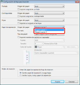 Seleccione un origen del papel que no sea la unidad de inserción. Cuando se alimenta papel desde la unidad de inserción, los nombres de capítulo no pueden imprimirse en los separadores de índice.