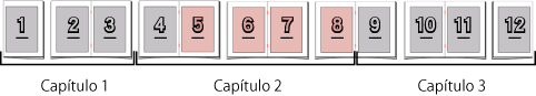 Si el documento original está compuesto por tres capítulos/12 páginas y el modo de color del tercer capítulo se establece en [Blanco y negro], las páginas en la misma hoja de papel que el tercer capítulo también se imprimen como [Blanco y negro].