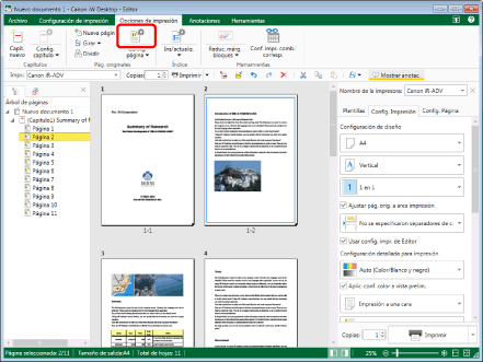 Esta función solo se puede utilizar si selecciona una impresora Canon y la casilla [Usar config. impr. de Editor] en la pestaña [Config. Impresión] de la Ventana Detalles, el comando de la cinta o el botón de herramienta.