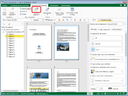 Esta función solo se puede utilizar si selecciona una impresora Canon y la casilla [Usar config. impr. de Editor] en la pestaña [Config. Impresión] de la Ventana Detalles, el comando de la cinta o el botón de herramienta.