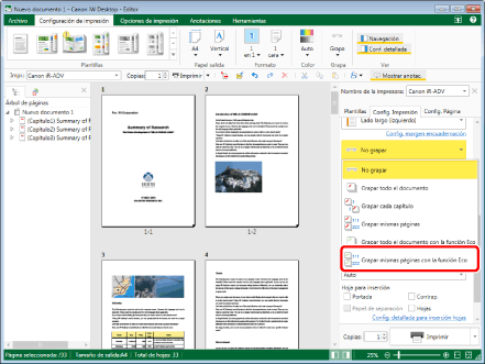 Esta función solo se puede utilizar si selecciona una impresora Canon y la casilla [Usar config. impr. de Editor] en la pestaña [Config. Impresión] de la Ventana Detalles, el comando de la cinta o el botón de herramienta.
