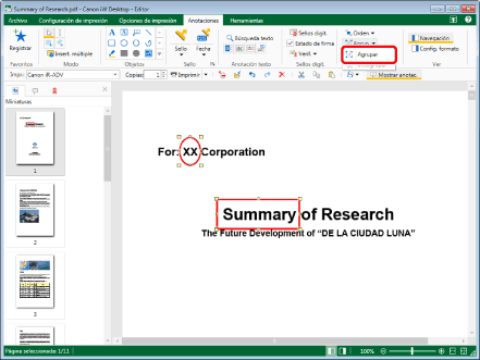 Puede crear grupos de grupos o agrupar un grupo con una sola anotación. Cuando agrupe dos grupos, se desharán sus agrupaciones previas y se reagruparán como un solo grupo.