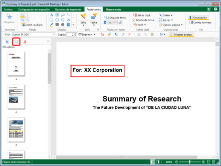 La pestaña [Miniaturas] aparece por defecto en la Ventana de navegación del Modo de anotaciones por defecto.