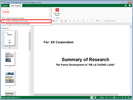 La información del certificado con firma creado en Desktop Editor puede comprobarse usando el método que se indica a continuación.