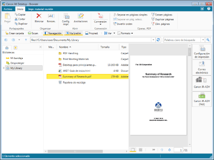 Los documentos de bibliotecas pueden imprimirse, enviarse por fax, enviarse por correo electrónico y editarse utilizando la pantalla del Desktop Browser. Como las carpetas de una biblioteca y dispositivos externos tales como imageRUNNER ADVANCE pueden monitorizarse, el estado de documentos que han sido añadidos o actualizados y el estado de dispositivos externos pueden comprobarse en la pantalla Desktop Browser.